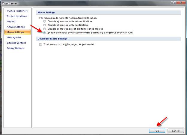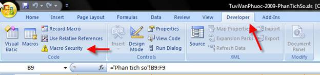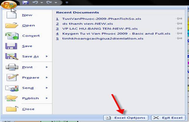 * Excel 2003 trở về trước: Mở MS Excel, trên menu\Tools\Macro\Security\Security Level...Phải chắc chắn rằng bạn đã chọn mục Medium hoặc Low. * Excel 2007: Theo mặc định, hộp thoại điều chỉnh Macro được ẩn giấu khá sâu trong hệ thống nên bạn hãy thực hiện từng bước theo các hình vẽ sau: